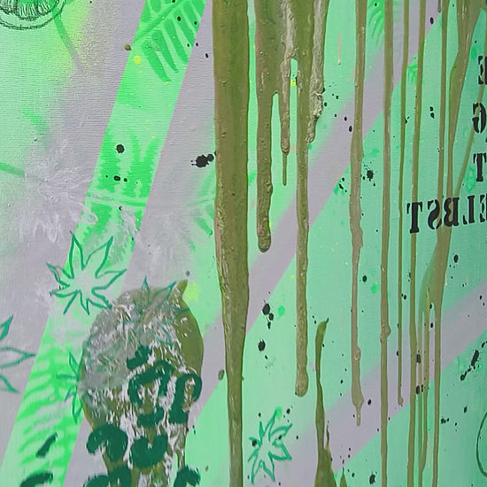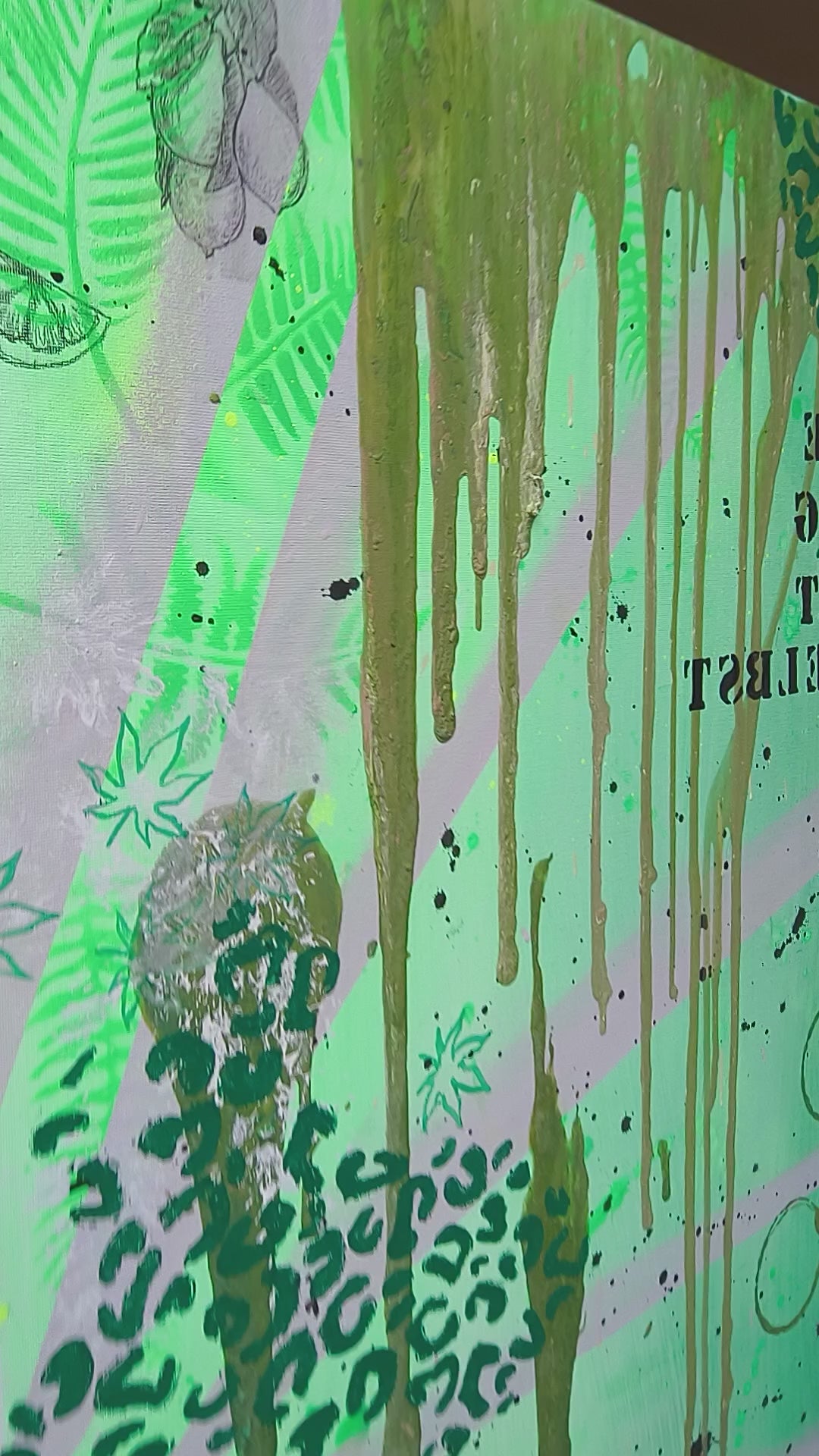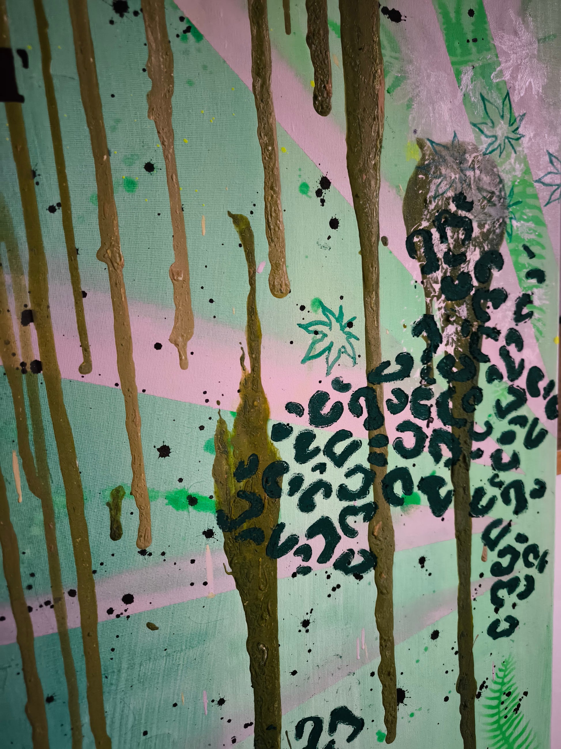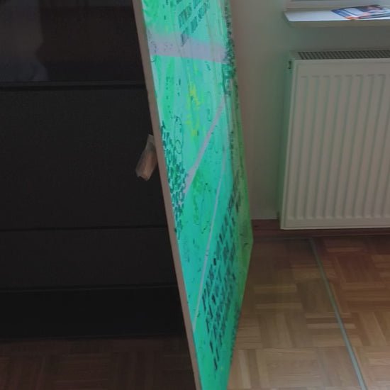 90 mal 120cm großes Einzelstück. Dieses Werk besticht nicht nur mit seinen tiefen Sprüchen, sondern auch durch seine Farbintensität.